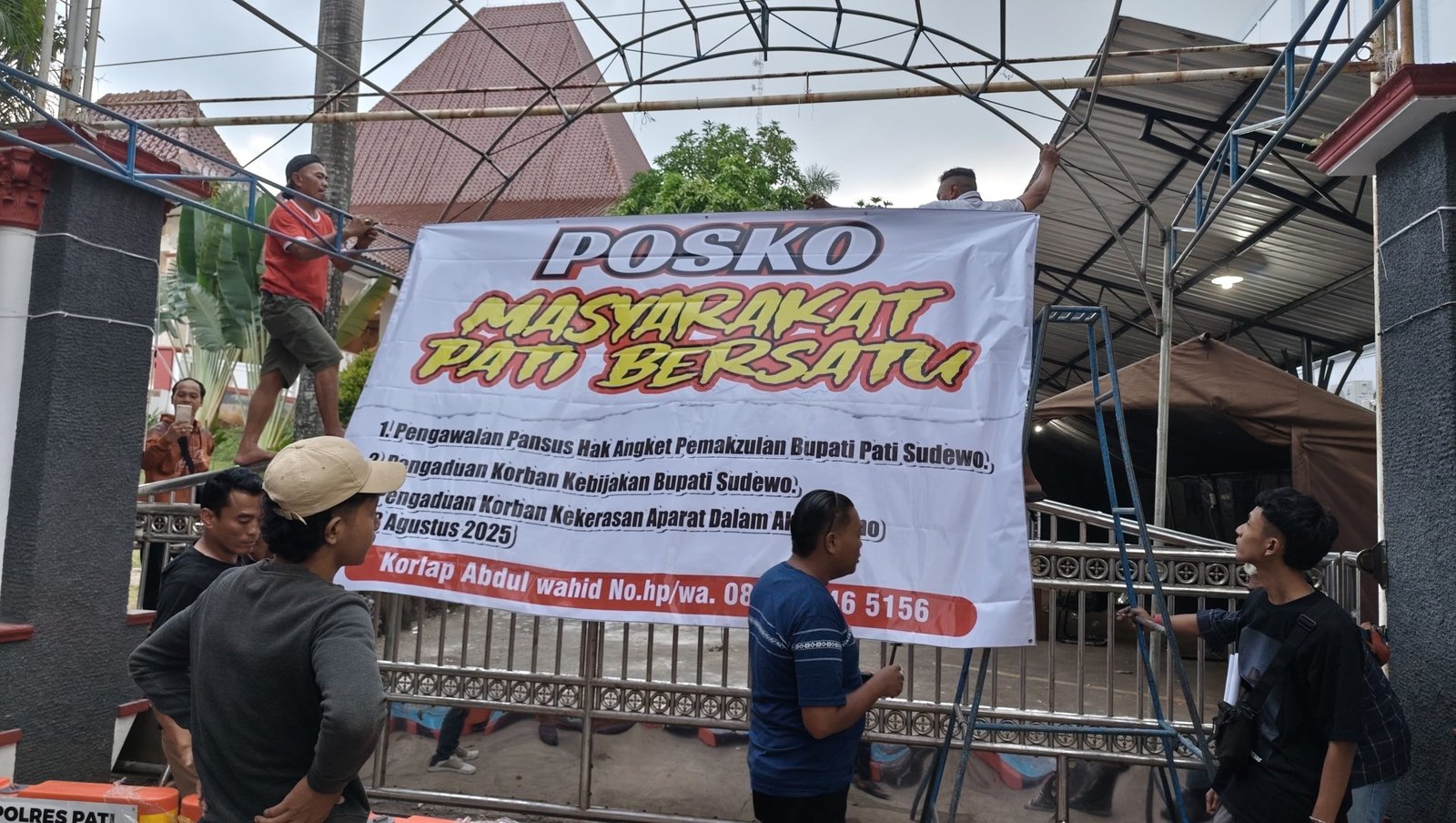 Di lokasi tersebut, terlihat sebuah tenda teratak dengan rangka besi dan spanduk putih berukuran besar bertuliskan “Posko Masyarakat Pati Bersatu”. Dalam spanduk tersebut dijabarkan tiga tujuan utama pendirian posko, yakni: