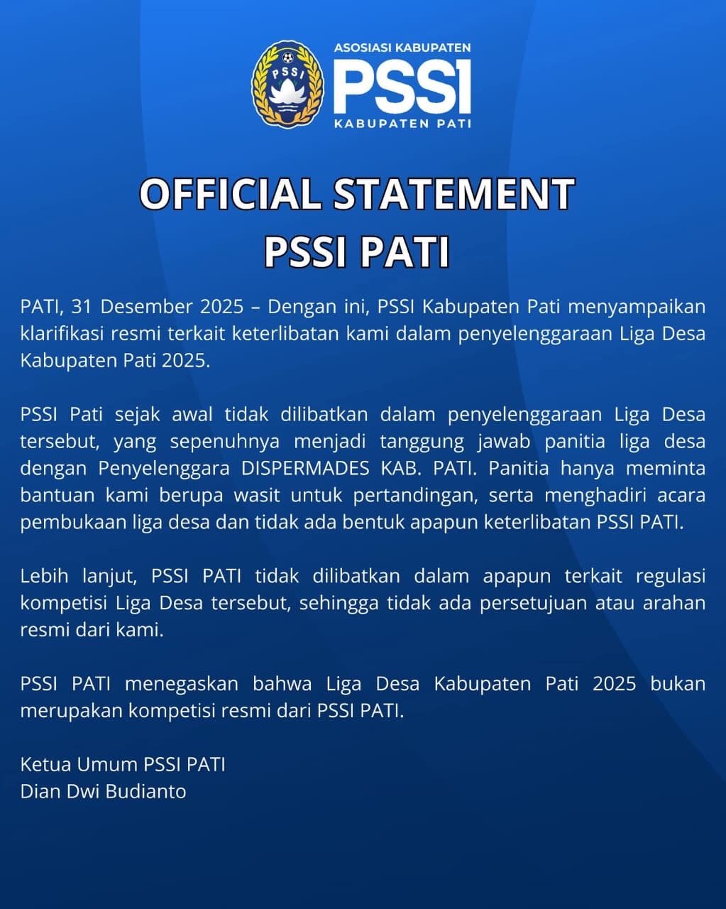 Dalam rilis tertulis yang disampaikan pada Selasa, 31 Desember 2025, PSSI Pati menegaskan bahwa sejak awal pihaknya tidak dilibatkan dalam proses penyelenggaraan Liga Desa Kabupaten Pati 2025. Kompetisi tersebut sepenuhnya menjadi tanggung jawab panitia Liga Desa dengan penyelenggara Dinas Pemberdayaan Masyarakat dan Desa (Dispermades) Kabupaten Pati.